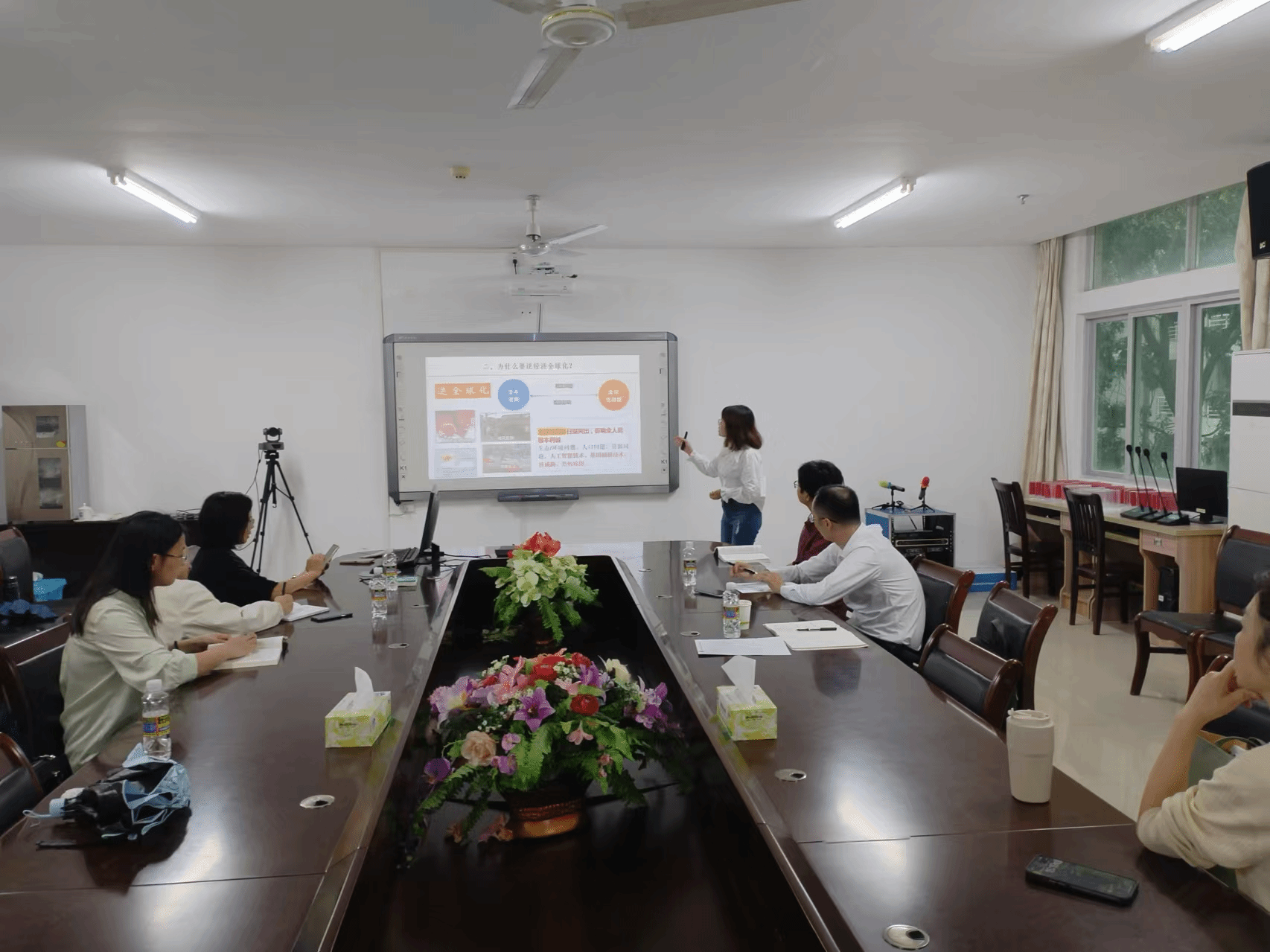 会议第三阶段,集体备课会总结。教研室主任最后强调三点:一是要体现与前后内容的关联性,经济全球化一定要联系马克思主义的普遍交往和世界历史理论;二是要注意问题与问题之间的过渡性,是什么、为什么、怎么办三个问题的过渡与转换要自然;三要强调中国作为发展中的大国不仅是经济全球化的受益者,更是经济全球化的维护者和贡献者。