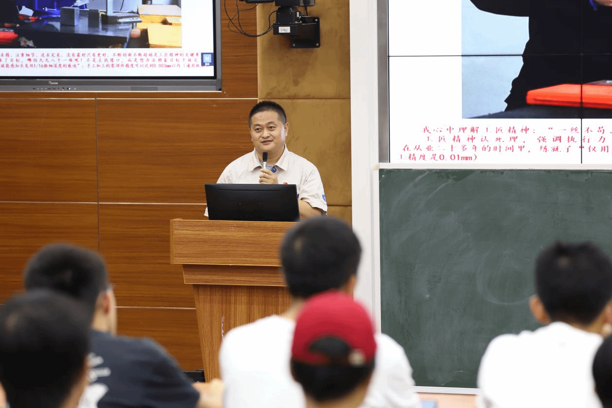 周皓首先分享了自己作为一名普通钳工的成长经历,在平凡的岗位上成就不平凡的事业靠的是执着与勤奋,每天在工作时间之外挤出三个小时磨炼技艺,克服种种困难,自学理论知识,抓住一切机会,参加培训学习,用极致的认真把专业技能做到最好,“只有拼了才有希望,而不是看到希望再去拼”是他最想告诉同学们的。