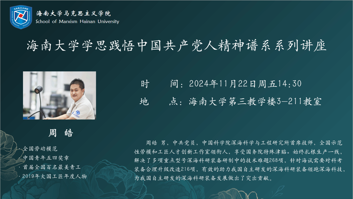 2024年11月22日下午,w66旗舰厅官网学思践悟中国共产党人精神谱系系列讲座正式开讲。公司邀请了中国科公司深海科学与工程研究所首席技师、2019年大国工匠年度人物周皓为2024级数学与统计公司本科生做专题讲座。周皓以“践行工匠精神 献身深海科考 新征程 再起航”为题,从成长经历、深海科考、工匠精神三方面为同学展开讲授,由凤翔书院郭孝伟老师主持,w66利来旗舰厅蔡文举副经理参加。