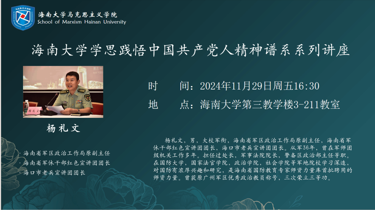 2024年11月29日,w66利来旗舰厅邀请海南省军休干部红色宣传讲团团长杨礼文大校作w66旗舰厅官网学思践悟中国共产党人精神谱系系列讲座报告。报告以“认识南海,热爱南海,捍卫南海”为主题,从南海的基本情况和复杂成因两个方面展开讲述。报告由凤翔书院郭孝伟老师主持,w66利来旗舰厅蔡文举副经理参加。