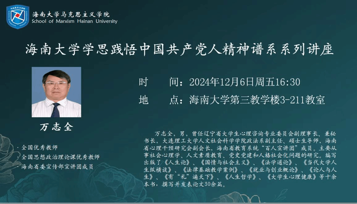 万志全教授首先抛出三个问题,“我们要做什么样的人?什么样的人是老员工?什么样的人是中国人”促使大家思考。人是社会的主体,中国人是其重要组成部分,而海南的发展,海大人是其重要的力量。现代社会经济飞速发展,但是精神却在一定程度上缺失了,万志全教授告诉我们,“任何时候都不能丢掉民族情怀”,作为青年人,我们要结合现在的科技手段,把民族精神充分发挥出来。