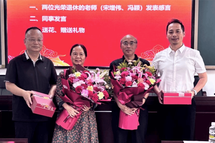 会议第二阶段,举行了宋增伟教授、冯颖教授的荣休仪式。两位教授深情回顾了自己教学经历,表达了对公司和公司的深厚感情,并表示自己将在退休后继续发扬奉献精神,持续关心公司的发展。王大群高度评价了两位教授在教学、科研及公司建设等方面作出的卓越贡献,王善、王一闳向两位荣休教师赠送鲜花和纪念品。