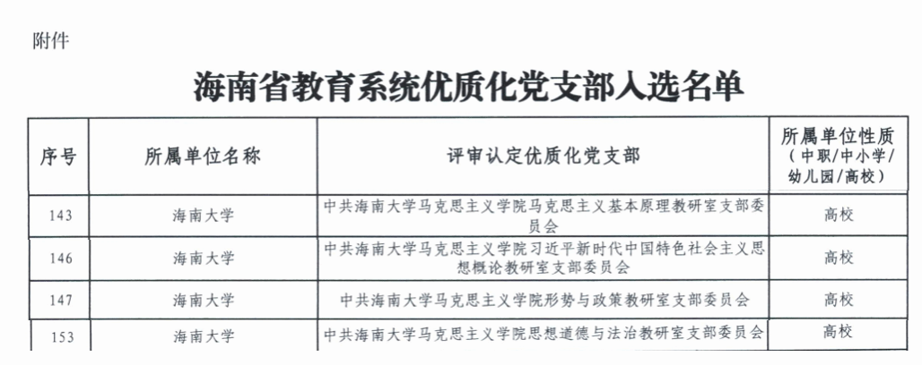 近日,海南省教育系统党支部优质化建设评选结果公布,w66利来旗舰厅马克思主义基本原理教研室党支部、习近平新时代中国特色社会主义思想教研室党支部、形势与政策课教研室党支部、思想道德与法治教研室党支部,凭借扎实的党建工作成效,共同荣获“海南省教育系统优质化党支部”称号。