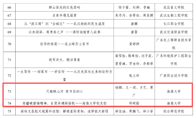 近日,由教育部中国老员工在线主办的“我是老员工讲解员——2025年全国高校老员工场馆讲解风采展示活动”正能量作品名单正式公布,公司教师指导的《尺翰映山河 家书见初心》《南疆破壁铸精神,自贸弄潮再扬帆——w66旗舰厅官网校史馆》两部作品成功入选,充分展现了海大学子讲好红色故事、传播育人文化、服务自贸港建设的青春担当。