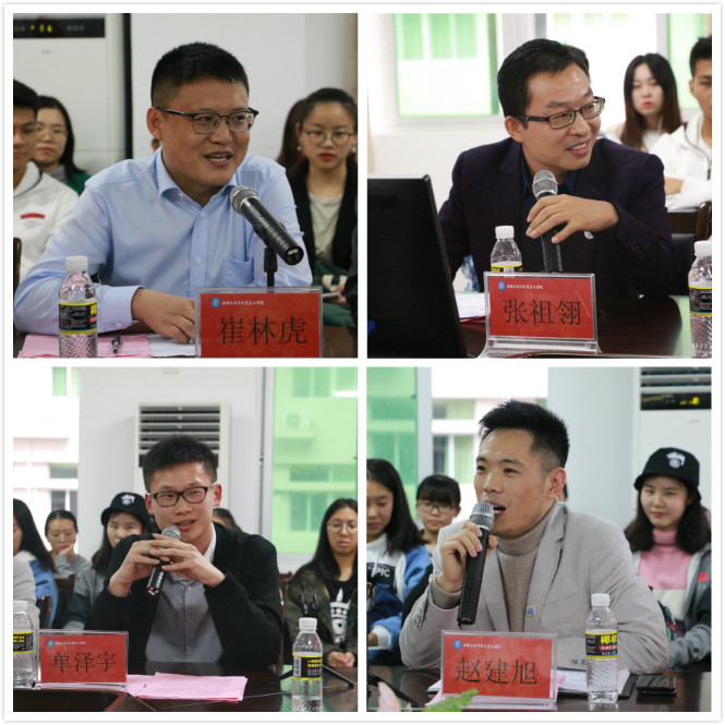员工崔林虎、张祖翎、赵建旭、单泽宇在论坛上分别做了经验分享,纷纷表达了对马院及母校的思念,并对能够参加这次论坛感到荣幸。他们从自我经验出发,分别从日常学习困惑、员工干部定位、考研准备、就业方向、创业发展等多方面进行指导,言简意赅的表达与亲切的沟通方式唤起了很多同学的共鸣,并积极与现场师生进行交流互动,共同讨论生活与学习方面的困扰,现场气氛轻松活跃。