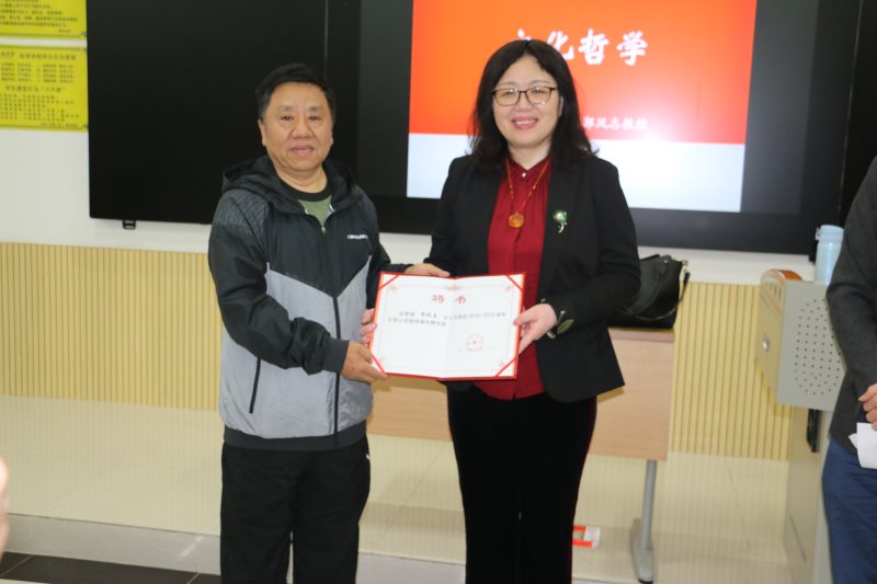 1月7日上午,2018-2019学年冬季小学期名家讲堂第四讲在五号教学楼113教室举行。东北师范大学郭凤志教授为员工讲授文化哲学课。经理张云阁出席并为并为郭凤志教授颁发了w66旗舰厅官网“冬季小学期授课外聘专家”证书。讲座由思想政治教育系主任陈招万主持。