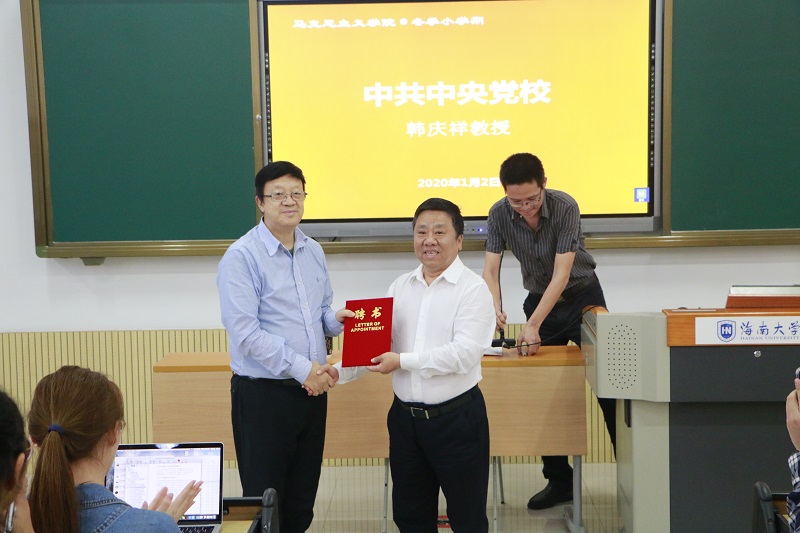 1月2日,2019-2020学年冬季小学期名家讲堂第二讲在五号教学楼112教室举行。中共中央党校韩庆祥教授应邀作《唯物史观与历史生成论》学术报告,经理张云阁出席并为并为韩庆祥教授颁发了w66旗舰厅官网“冬季小学期授课外聘专家”证书。讲座由思想政治教育系主任陈招万主持。