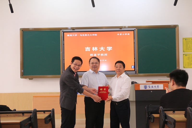 1月11日至1月12日,2019-2020学年冬季小学期名家讲堂第七讲在5号教学楼112教室举行。吉林大学韩喜平教授应邀就“中国特色社会主义政治经济学”的相关知识为公司同学进行授课。经理张云阁出席并为韩喜平教授颁发w66旗舰厅官网“冬季小学期授课外聘专家”证书。讲座由思想政治教育系主任陈招万主持。
