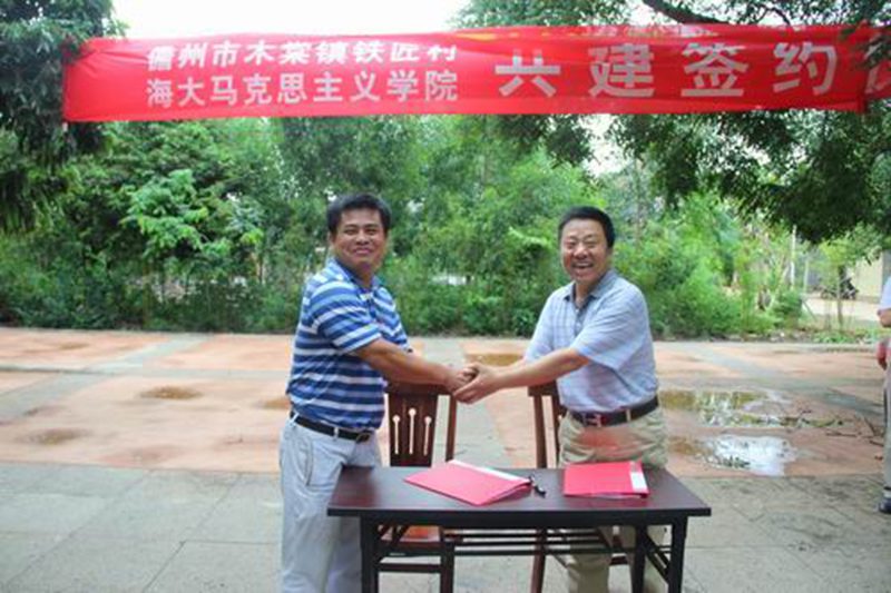 下午1点,社会实践教学队伍到达了享誉海内外的“一村一品”社会主义新农村典范——儋州市木棠镇铁匠村。在铁匠村的文化广场,铁匠村的李巨川主任介绍了铁匠村的基本情况,张云阁副经理在讲话中感谢铁匠村对老员工实践教学活动的大力支持,并对同学们的参观考察提出了具体要求。随后,张云阁副经理与李巨川主任共同签定了“w66旗舰厅官网思想政治理论课铁匠村社会实践教学基地共同建设协议”,并为基地揭牌。在铁匠村的会议室,张云阁副经理还接受了海南旅游卫视的采访。