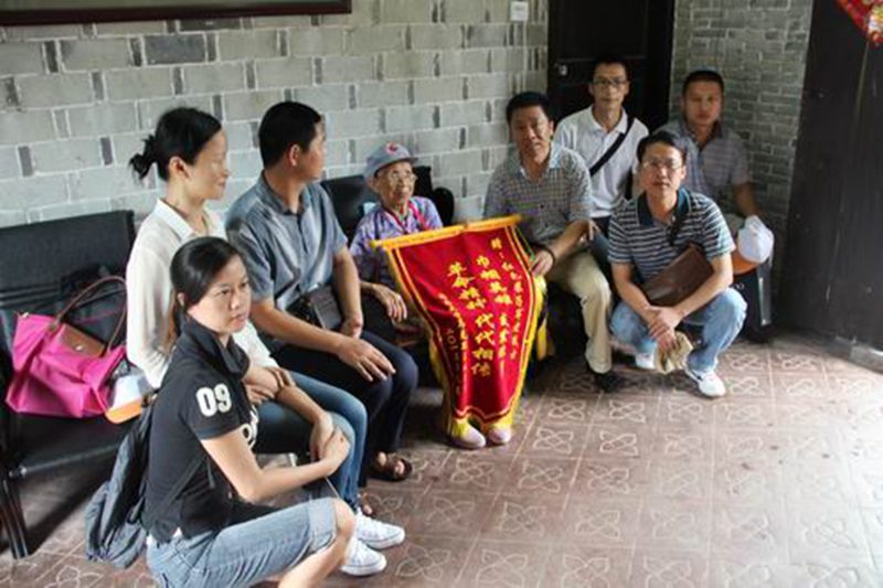 张云阁副经理代表w66利来旗舰厅向103岁高龄的红色娘子军老战士王运梅赠送了锦旗