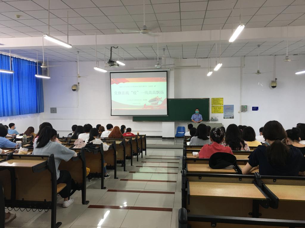 段捷频以“党旗在战‘疫’一线高高飘扬”为主题作讲授。他指出,新冠肺炎突如其来,党中央高度重视,习近平总书记亲自指挥、亲自部署,打响了疫情防控的人民战争、总体战、阻击战。在党中央坚强领导下,各级党组织和广大党员、干部冲锋在前、英勇奋战,医务工作者和支援湖北医疗队员白衣执甲、逆行出征,人民解放军指战员闻令即动、勇挑重担,广大社区工作者、公安干警、基层干部、下沉干部、志愿者等广大群众众志成城、踊跃参与,谱写了波澜壮阔、感天动地的战“疫”史诗。让我们深刻认识到中国共产党强大的战斗力和凝聚力,深刻感受到中国特色社会主义制度的优越性。他强调“生命重于泰山,疫情就是命令,防控就是责任,”党的全部力量来自组织,而防控一线又是检验初心使命的试金石,是锤炼担当斗争精神的磨刀石。中国共产党时刻为人民而战、靠人民而胜。全党全国人民上下一心,共同阻止疫情,就一定能够战无不胜。他对同学们提出五点希望,一是积极传播正能量,弘扬中国精神,自觉抵制负面舆情;二是要肩负起青年马克思主义者的使命担当,与祖国同呼吸共命运;三是积极发挥好党组织战斗堡垒作用和党员先锋模范作用;四是要把常态化疫情防控和复学复课两手抓,两手都要硬,五、迅速在公司开展文明大行动和爱国卫生运动,展现马院新风尚。