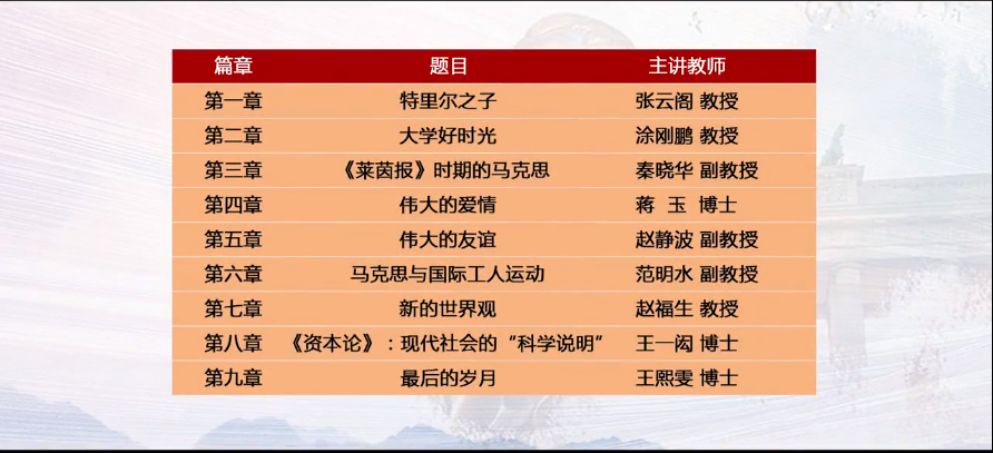 本课程以马克思65年的生命历程为轴线,以马克思思想发展历程为刻度,九个老师,九个篇章,以叙事的方式,用老员工喜欢听、听得进的语言,讲述马克思胸怀崇高理想,为人类解放不懈奋斗的一生;不畏艰难险阻,为追求真理而永攀思想高峰的一生;为推翻旧世界建立新世界而不息战斗的一生;告诉同学们马克思是顶天立地的伟人,也是有血有肉的常人。