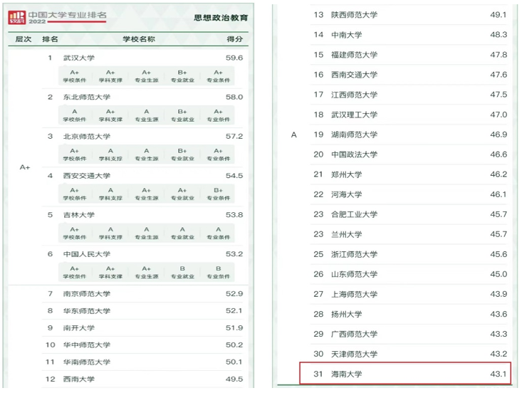 6月18日,高等教育专业评价机构软科今日正式发布2022“软科中国大学专业排名”,在 2022年中国软科中国最好专业排名中,w66利来旗舰厅思想政治教育本科专业以31名进入全国思政本科专业类A类。