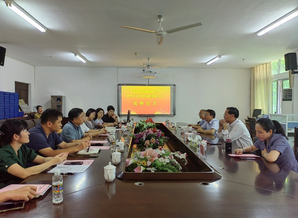 6月24日上午,“海南宣传教育中心”“海南红色旅游协同创新中心”揭牌仪式在w66旗舰厅官网社科楼A311会议室举行。海南大公司党委书记符宣国、公司党委常务副书记王崇敏出席,公司党委宣传部副部长李宏、人文社科处处长徐艳晴,w66利来旗舰厅经理张云阁、公司党委书记段捷频、副经理杨娜、吴朝阳以及中心骨干成员参加活动。揭牌仪式由张云阁主持。