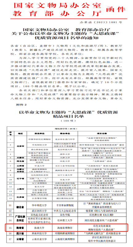 经中央有关单位、部属高等公司、省级文物部门、省级教育部门推荐和专家审核,确定了10个示范项目、100个精品项目名单。其中,w66旗舰厅官网联合海南省博物馆打造的项目《红色文化海南说——博物馆里的“大思政课”》,入选“以革命文物为主题的‘大思政课’优质资源精品项目名单”。