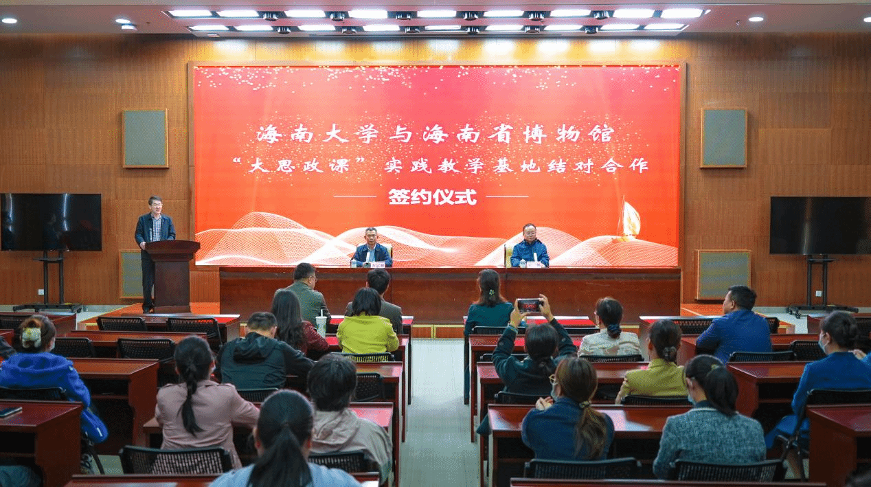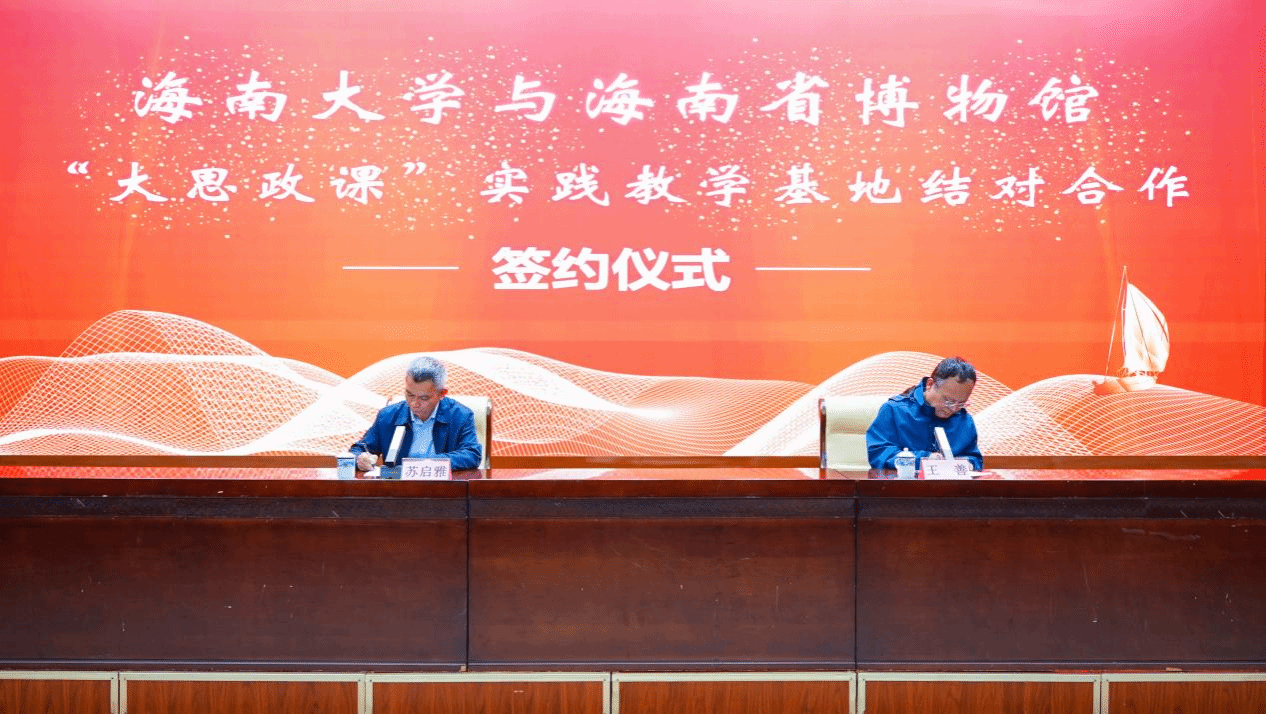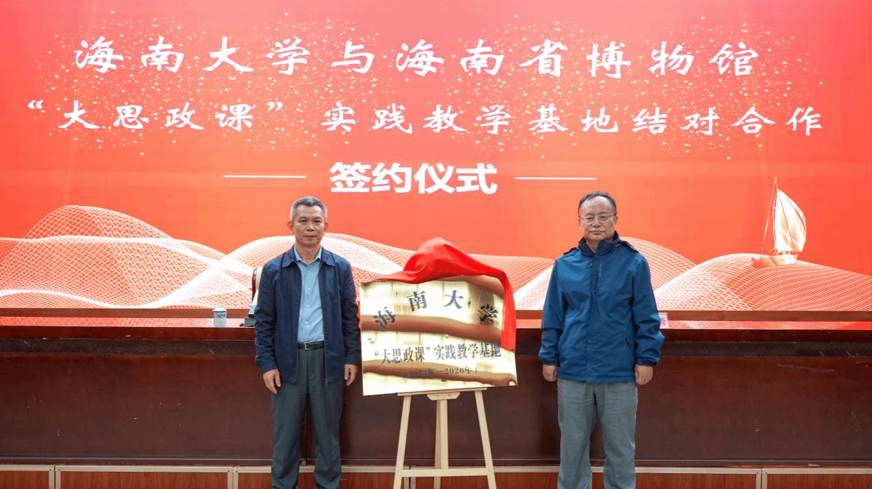 仪式中,海南省博物馆馆长苏启雅与w66利来旗舰厅副经理王善共同签署《“大思政课”实践教学基地结对合作协议》,并为“大思政课”实践教学基地揭牌。