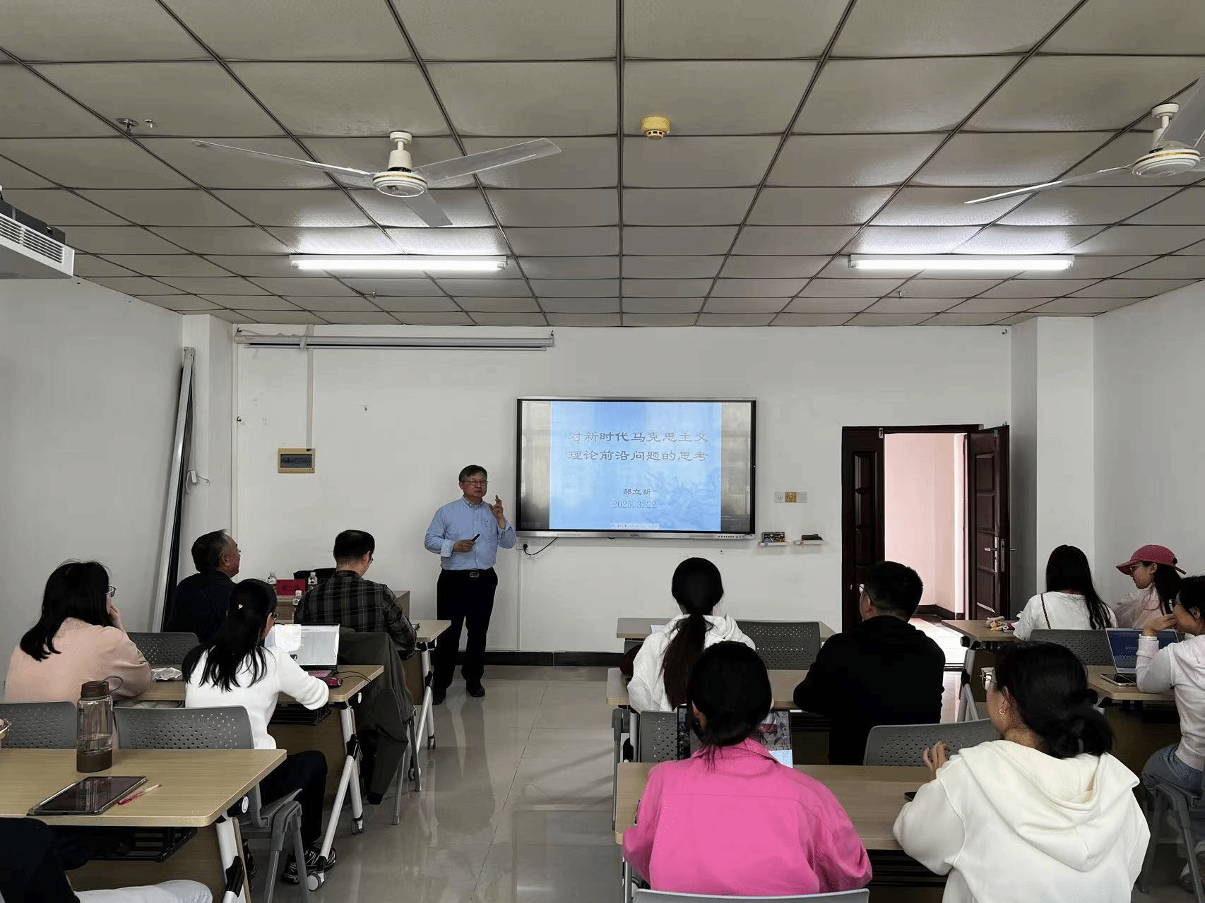 2025年3月22日下午3:30,应w66利来旗舰厅邀请,中国人民大学哲公司和w66利来旗舰厅教授,教育部特聘教授郝立新在社科楼A615会议室为公司师生作“对新时代马克思主义理论前沿问题的思考”专题讲座。讲座由w66利来旗舰厅赵福生教授主持,公司部分教师、硕博员工参加了本次讲座。