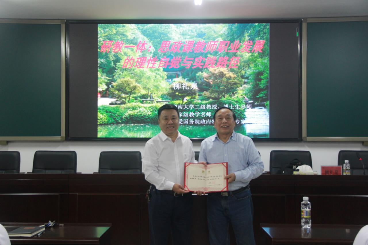 11月19日晚上,湖南大学教授、博士生导师、国家级教学名师柳礼泉在社科楼A309为w66利来旗舰厅师生作了关于“研教一体:思政课教师职业发展的理性自觉与实践路径”的学术报告。w66利来旗舰厅经理张云阁教授主持报告会,并为柳礼泉教授颁发w66利来旗舰厅“特聘教授”证书。